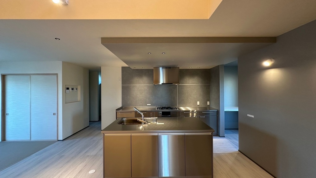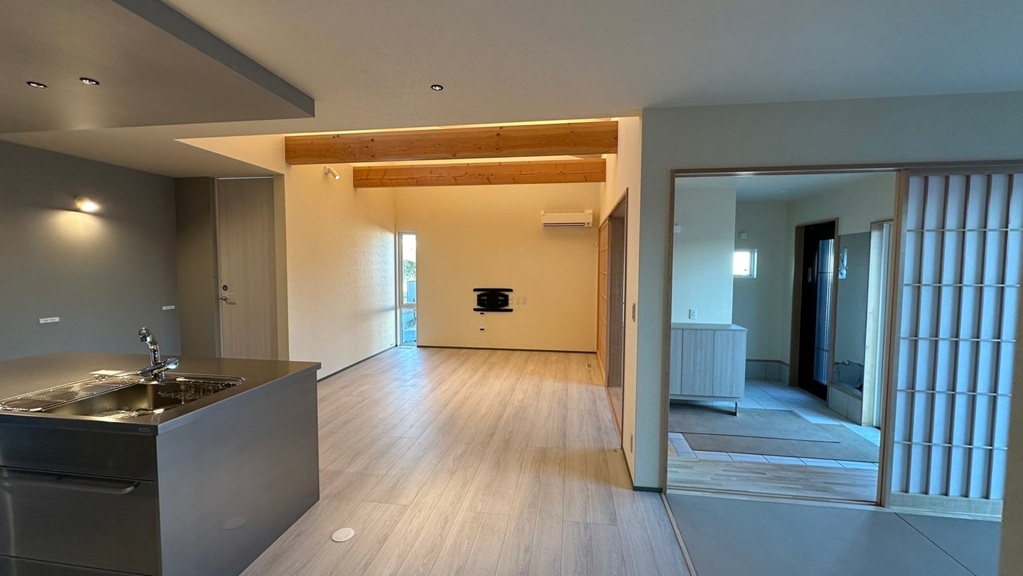 キッチンからリビングを見た写真です。 ポーチの土間も和室から見えます。ステンレスキッチンでスッキリ納めている中