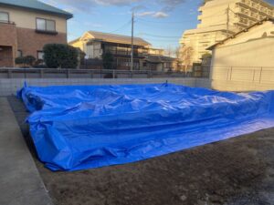 今日の現場は、朝日町のA様邸です。 基礎工事が完了しました報告をします。 こちらの写真は、根切を行いターミダンシートを敷いたところです。