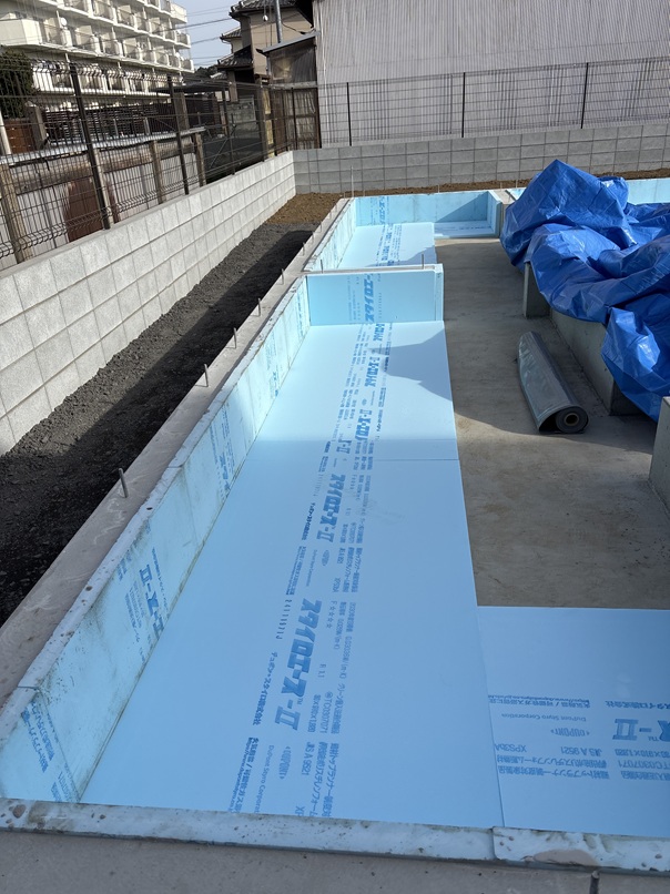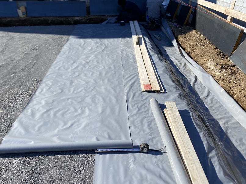 今日の現場は、朝日町のA様邸です。 基礎工事が完了しました報告をします。 こちらの写真は、根切を行いターミダンシートを敷いたところです。