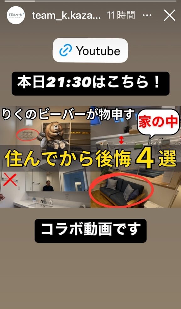 寝る前にYouTubeをみたら今日UPされたようです 2024年12月21日 最終更新日時 : 2024年12月21日 team-K風間 今日は、寝る前にYouTube動画を色々見てましたら 「陸のビーバー」さんとのコラボ動画がUPされていました。 今回コラボ動画で今日21時30分にUPされました。 スキップモデルの間取りに興味のある方 又は、Fcon体感で興味のある方は、お問い合わせお待ちしています。(^^♪ 23時近くに動画を見てついブログUPしてしまいました。(*´Д`)