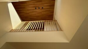 吹き抜け上の2階の廊下の木の格子もお客様好みの内容で設置できました。(^^♪