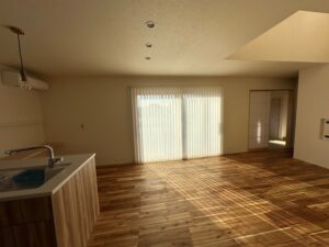 室内も何枚かUPします。 アカシアの無垢床にキッチンも一部木を使い、広々としたリビング、ダイニングです。