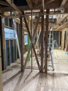 こちらは、朝日町のA様邸です。土台敷、根太レス合板 張りが終わり、上棟材の準備をしました。