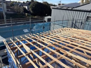 こちらは、昨日ルーフィングまで終わりました 朝日町のA様邸になります。 タルキを打ったところの写真になります。
