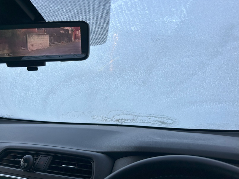 車を取りに行ったらフロントガラスが真っ白でした。 バックは、カメラなので見えていますがガラスは、真っ白です!