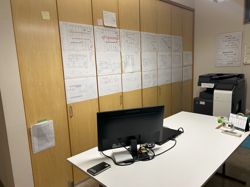 今日の午後は、本社で工程表図面を張り付けました。 昨年12月に4件の引き渡しがあり進行物件がかなりへりましたが7件の物件を張りました。