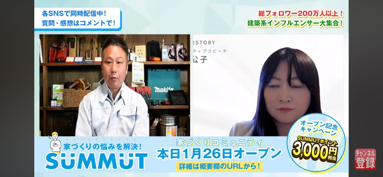 SUMMUT「家づくりコミュニティ」 今日オープンしました。 2025年1月26日 最終更新日時 : 2025年1月26日 team-K風間 SUMMUT「家づくりコミュニティ」 今日オープンしました。 SUMMUTプロジェクトの内容に賛同しまして資産価値の下がらない家づくりを増やしていく方針で今後提案をしてきます。 今日、YouTube動画で配信していましす。アーカイブ動画で3日間視聴できます。 興味のある方は、職人社長YouTube動画を参考にしてただければと思います。 今日までに報告したくUPさせて頂きます。