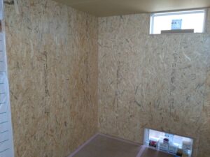 室内は、OSB合板仕上の壁が貼られました。 天井は、クロスです 仕上がりまじかですね(^^♪