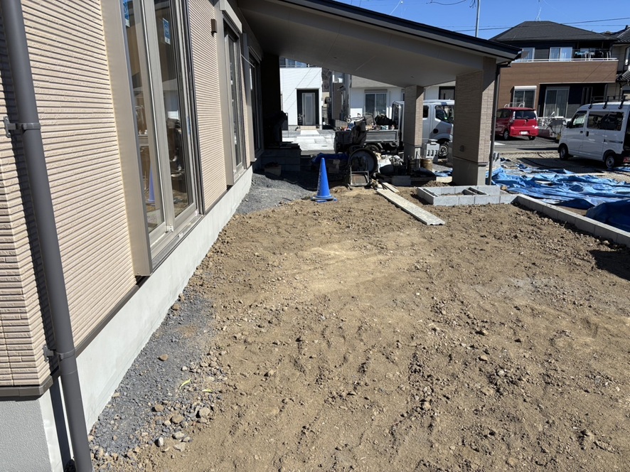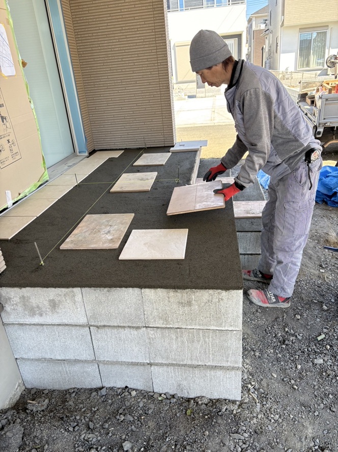 玄関ポーチのタイルを張り始めました。 順調に進んでいます。 来月引き渡しができそうですね(^^♪