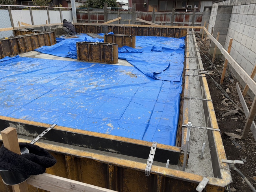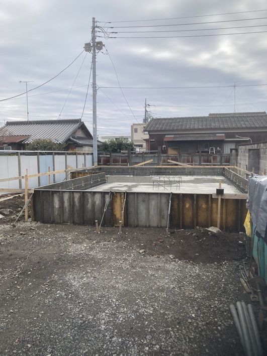 現状立ち上がりの枠を建て、土間コンを打ったところです。  来週土台敷ができそうですね(^^♪