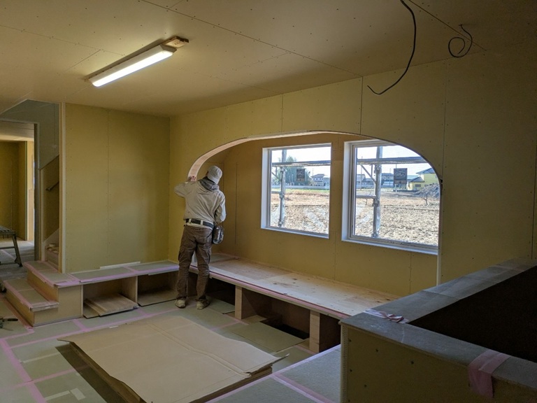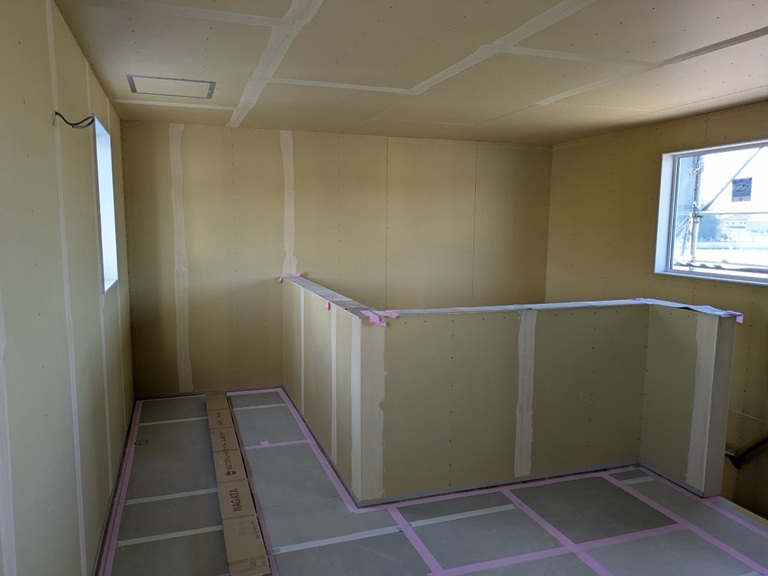 2階は、パテがはじまりました(クロスを貼る下地調整です) 仕上がりが楽しみですね(^^♪