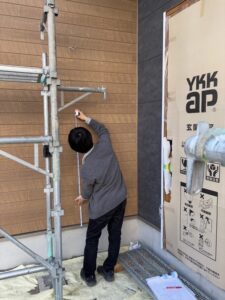 電気配線の高さ確認です。 インターフォンの高さを確認しているようです。 外部作業はヘルメット!(注意しておきます)