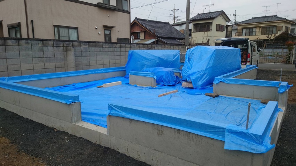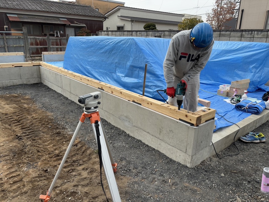 今日は、スッキリいないお天気の中 土台敷を行いました。