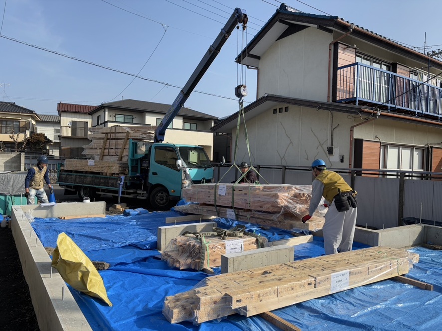 赤坂町の倉庫の土台を行いました。朝のうち材料おろしをしました。「タツミー」「ふじまー」で降ろしています。「アキラー」は、「あれ俺のところにこないのか?」という感じですね( 一一)