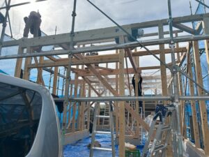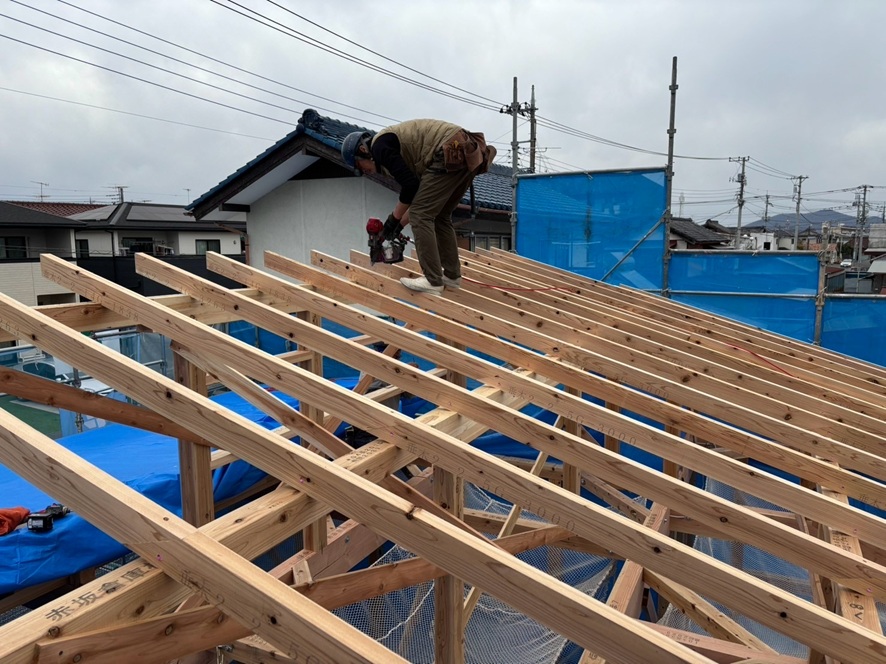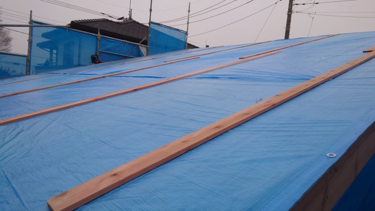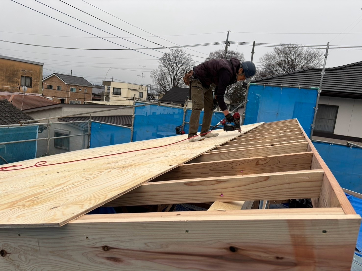 野地を打つ「アキラー」! 「タツミー」棟梁と野地を行いました。