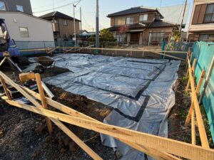 免震材の上にターミダンシートを敷いてこのシートでシロアリ20年保証を実行できます。 22.23日ではじめ予定していましが