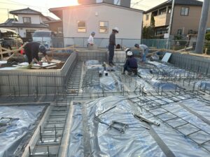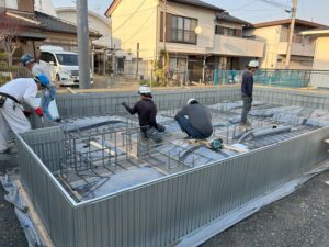こちらは、昨日の植下モデルの免震基礎工事の写真です。布基礎一発打ちの工法です。 黒いのが免震ゴムのような物です。