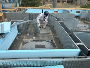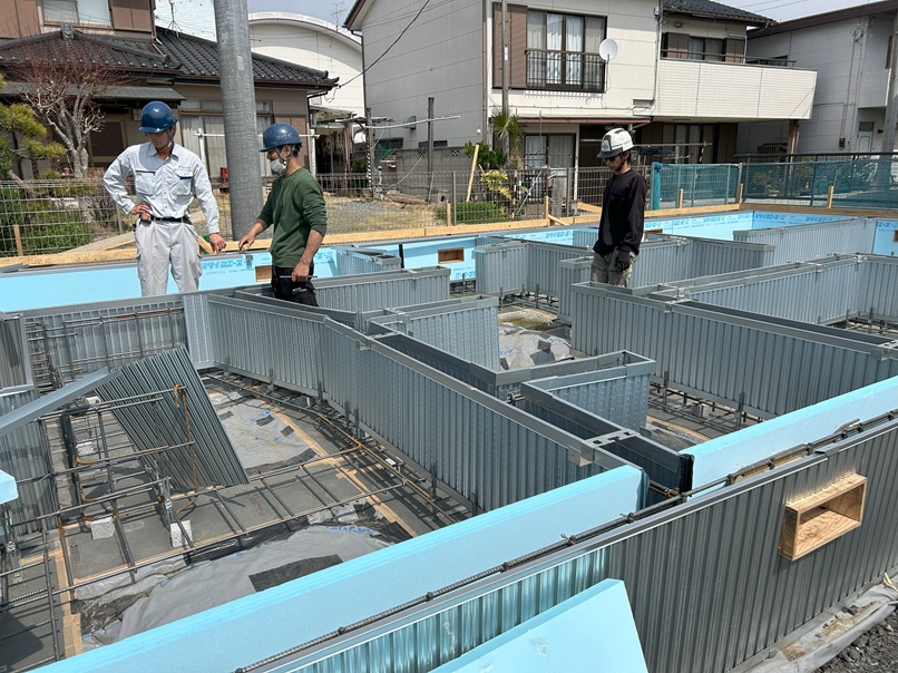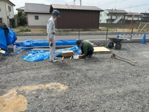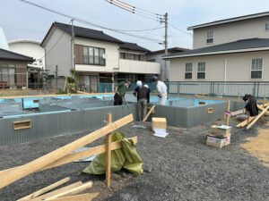 免震基礎工事もだんだん格好がついてきました。 今日は、YouTubeで動画報告できるよう「よっしー」も