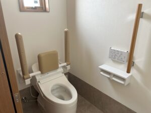 トイレも両肘が付けらて立つのに楽なバーが付いています。