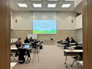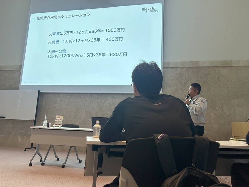 講演は、こんな雰囲気でインフレの時代につよい取り組み(この写真は、太陽光のシミュレーション)等