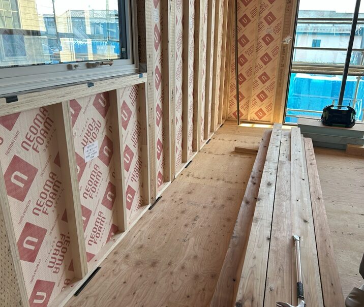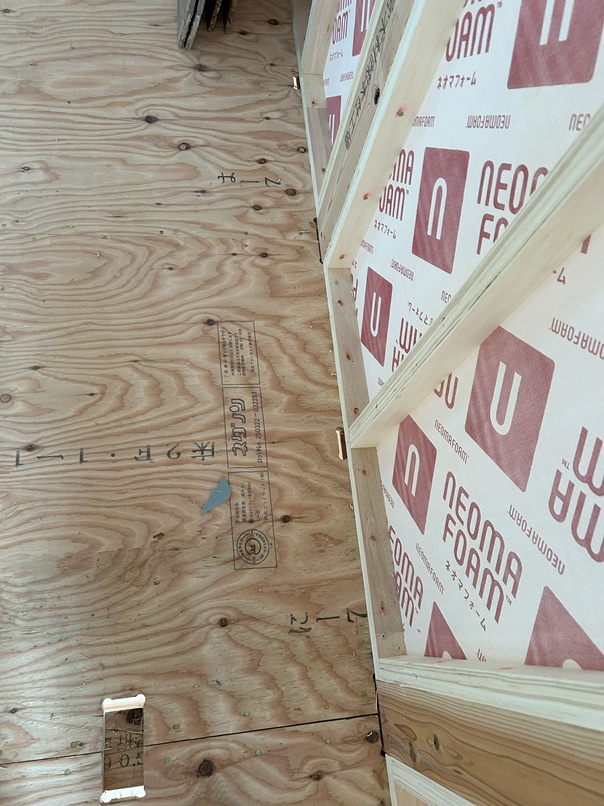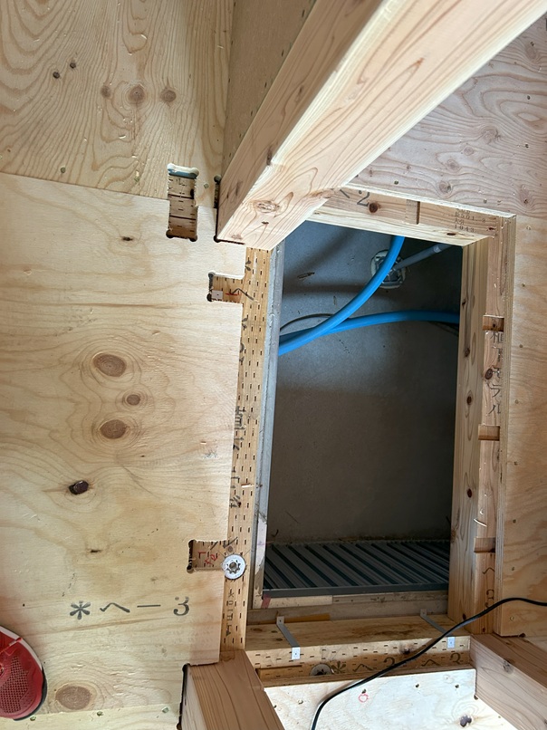 2階の床からの写真です。 間柱部分に切り込みを入れていいます。床下からの空気を屋根裏に運び屋根裏から排出します。