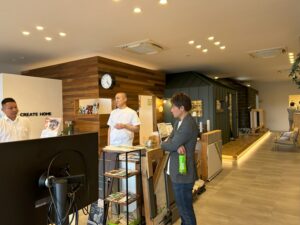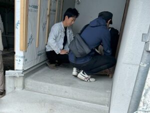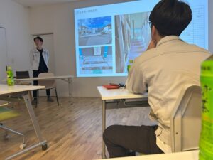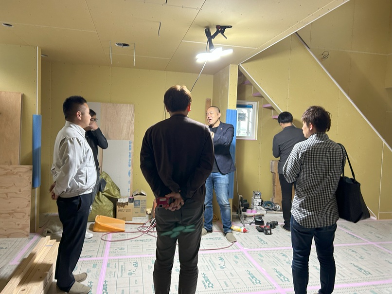 室内は、木工事が終わるところまで進んでいる状況です。「星川社長」の話をみんな聞いているところです