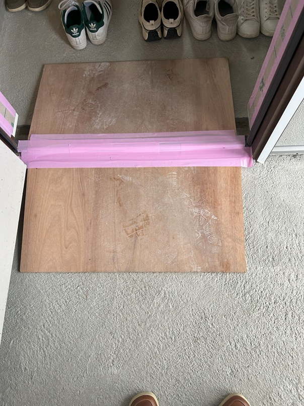 玄関ドアの敷居の養生がいい塩梅にしてありました。
