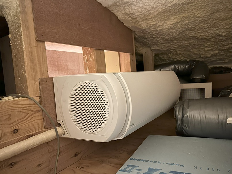 自分は、小屋裏エアコンの写真を撮ってきました。 「松尾モデル」を弊社が作った時の内容と同じ原理での施工でしたので