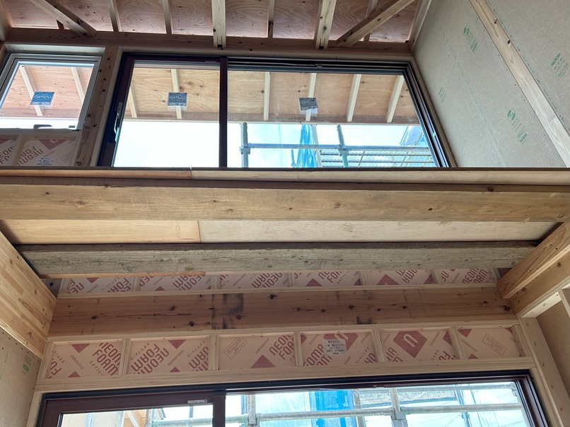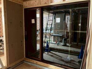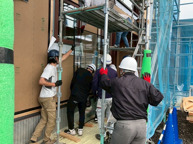 サッシ屋さん、弊社工務、社員大工メンバーにより無事大型ガラス入れ完了しました。昨日遅くまでありがとうございました。m(__)m