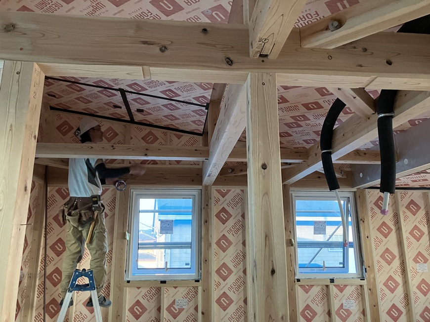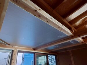 今日は、植下モデルの報告をします。大屋根の下の断熱工事がはじまりました。