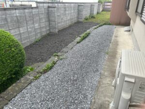 西の敷地も草が生えないようにと防草シート+砂利を敷きました。 どくだみは、生えていました~強い草ですね('_')