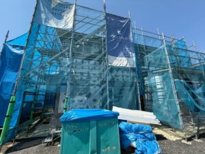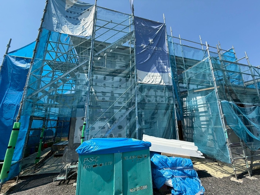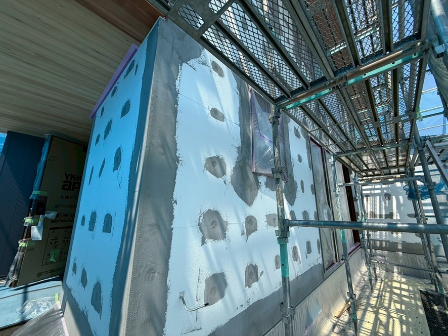 外観は、こんな感じです。 これから下塗りがはじまるという感じですね。