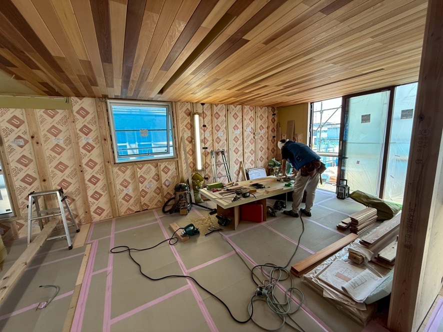 2階は、天井下地が終わり、ボード搬入が出来ていました。 2階にあがりましたら2階の方が暑くなかったです。