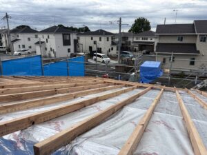 こちらは、月曜日建て方をしました寺中町のK様邸です。 大屋根のタルキ施工写真です。 タイベックシルバーを敷いてその上から