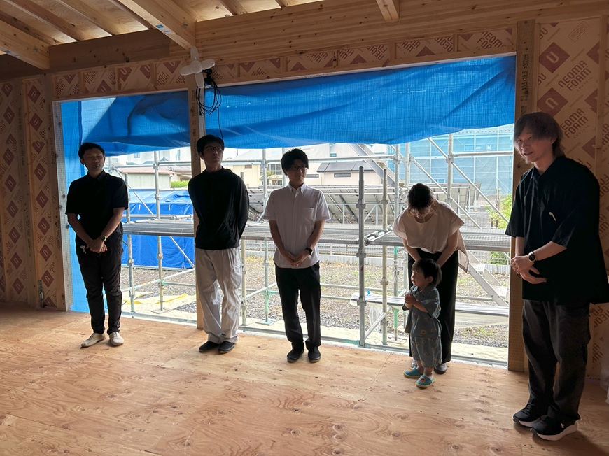 拝礼~乾杯を行ない~自己紹介をしているところです。 担当大工は、「アキラー」社員大工長が責任をもって対応します。
