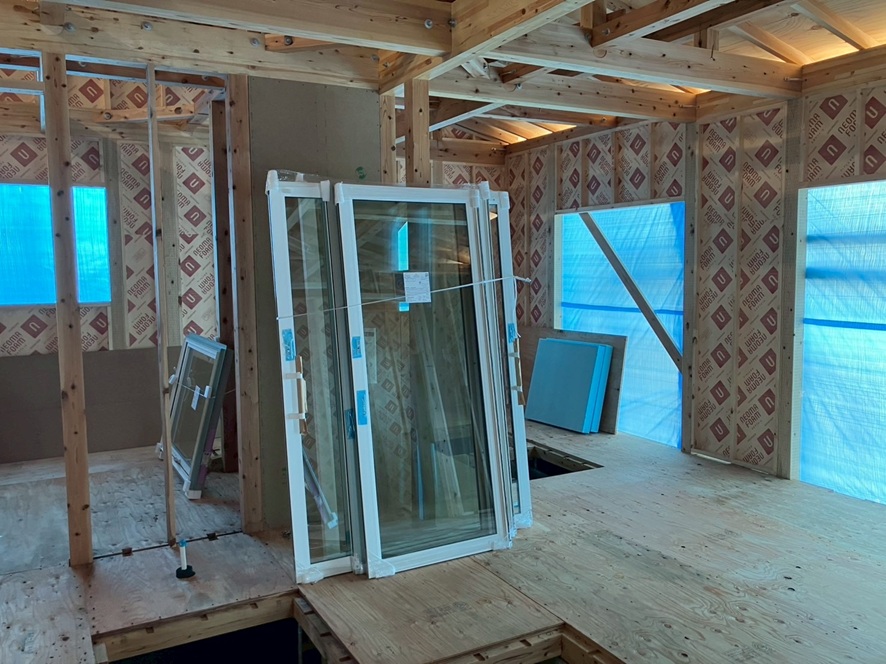 今日は、サッシが搬入され明日は、サッシ取付に入ります。 段々できていくのが楽しみですね(^^♪