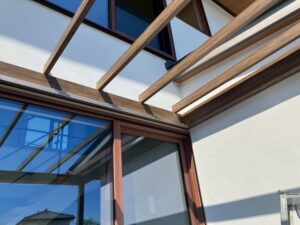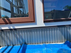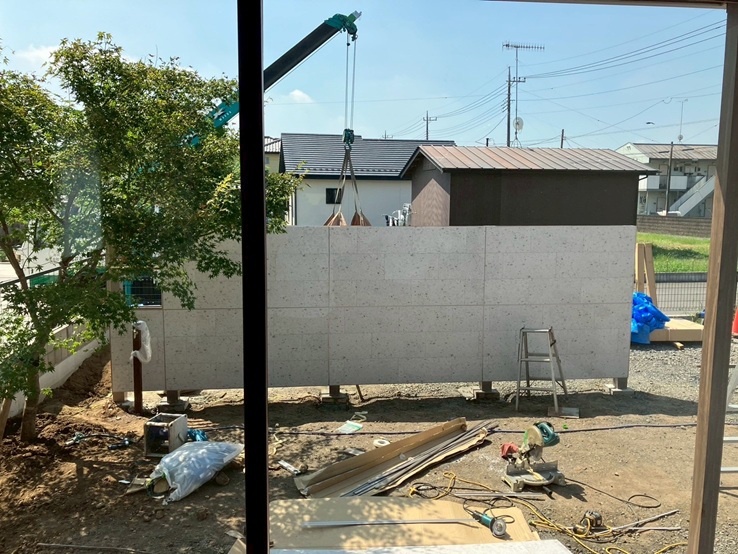 リビングからみますと紺か感じです。大谷石風の壁もできてきました。 暑い中ご苦労様ですm(__)m