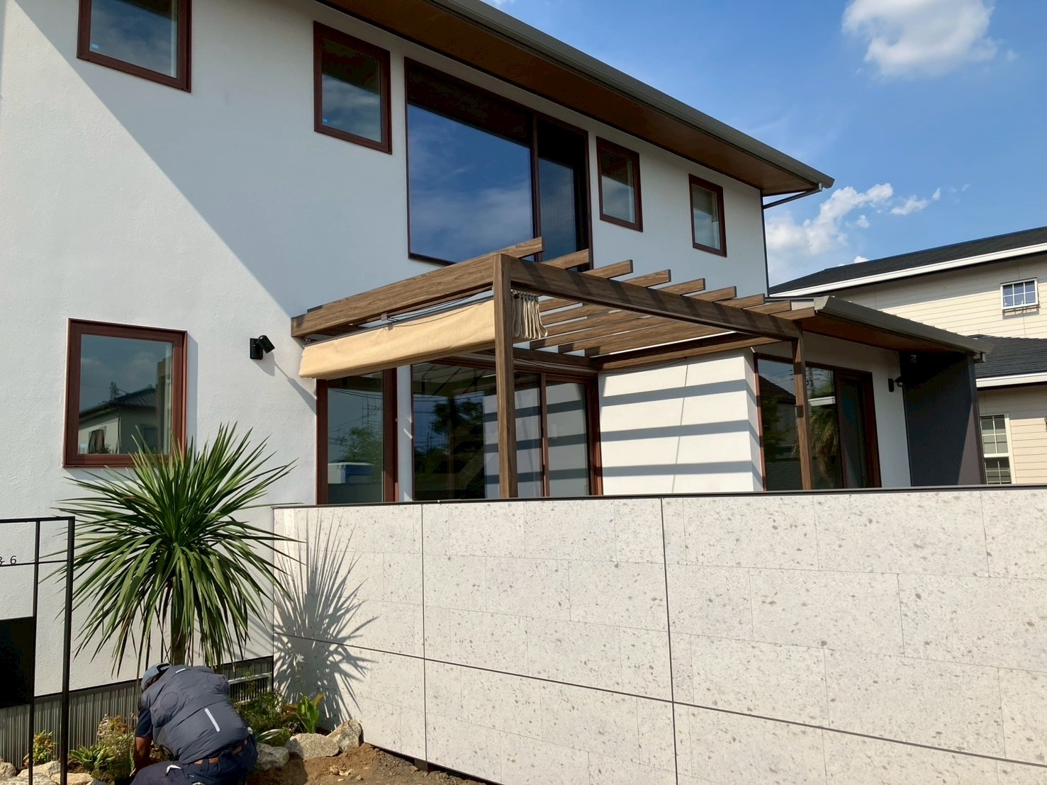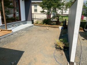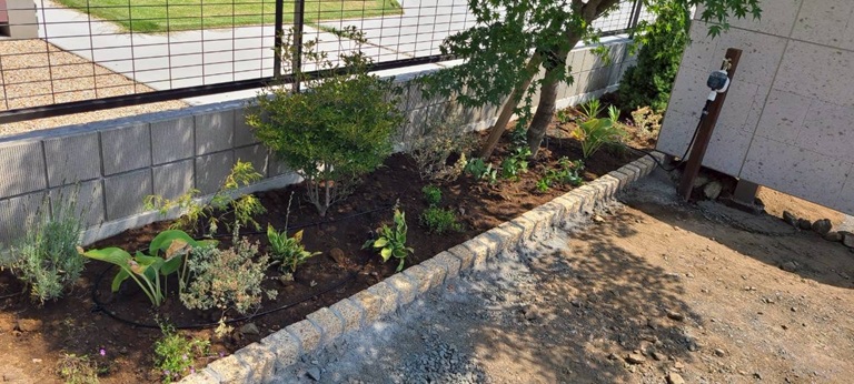 植下モデルも外構が進んでいます。造園も一緒に進んでいます。 水もまく仕事も増えていますがスタッフが頑張ってくれています。