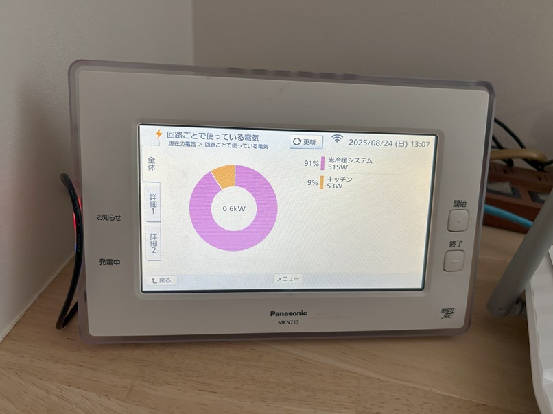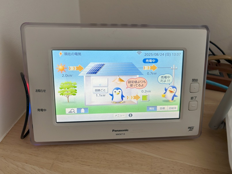 太陽光で発電した電気は、2kwで1.1kw使用、0.2kw蓄電池に貯め0.7kw売電していました。