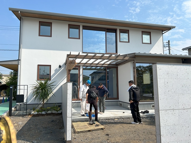 今日は、植下モデルの外構工事に朝にうち立ち合いました。 玄関ポーチのスロープと、塀の間の土間工事の段取りをしています