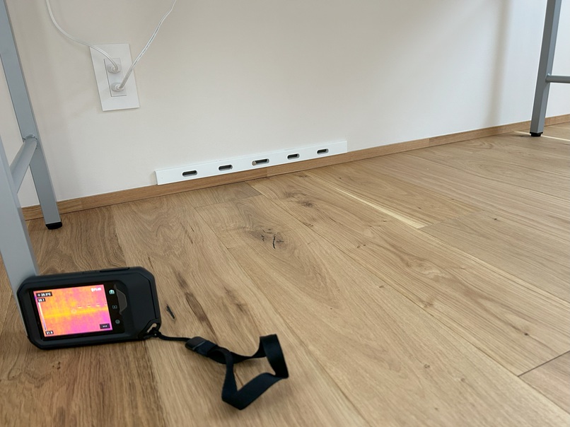 巾木の上に付いている「フローヘルツ」を開けて遠赤外線で確認しても壁の中の温度が低いのがわかります。