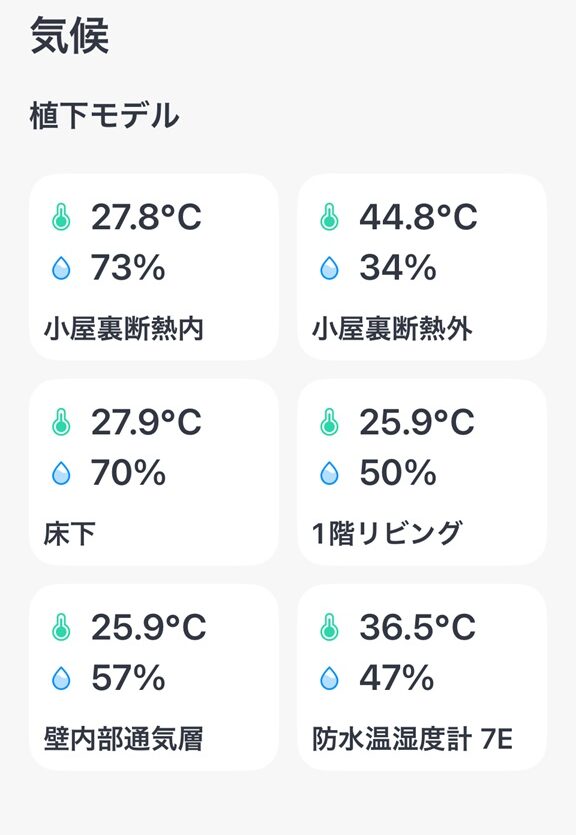 今日13時半にいきましたら 外気温36.5℃ 屋根裏断熱外44.8℃ 屋根裏断熱内27.8℃ 床下27.9℃
