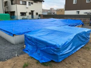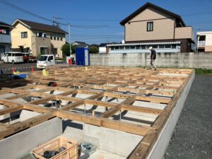 こちらは、堀米町のM様邸です。土台敷が終わり、第三者機関の方の立ち合いで土台の検査をしているとこです。