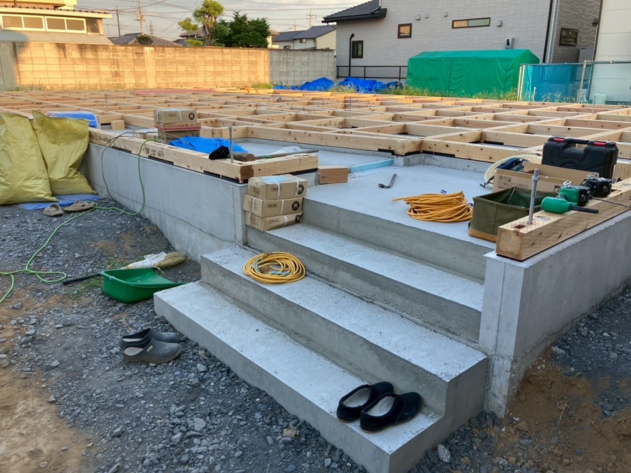 玄関ポーチの荒打ちも終わりました。基礎から土足厳禁でバッチリですね!