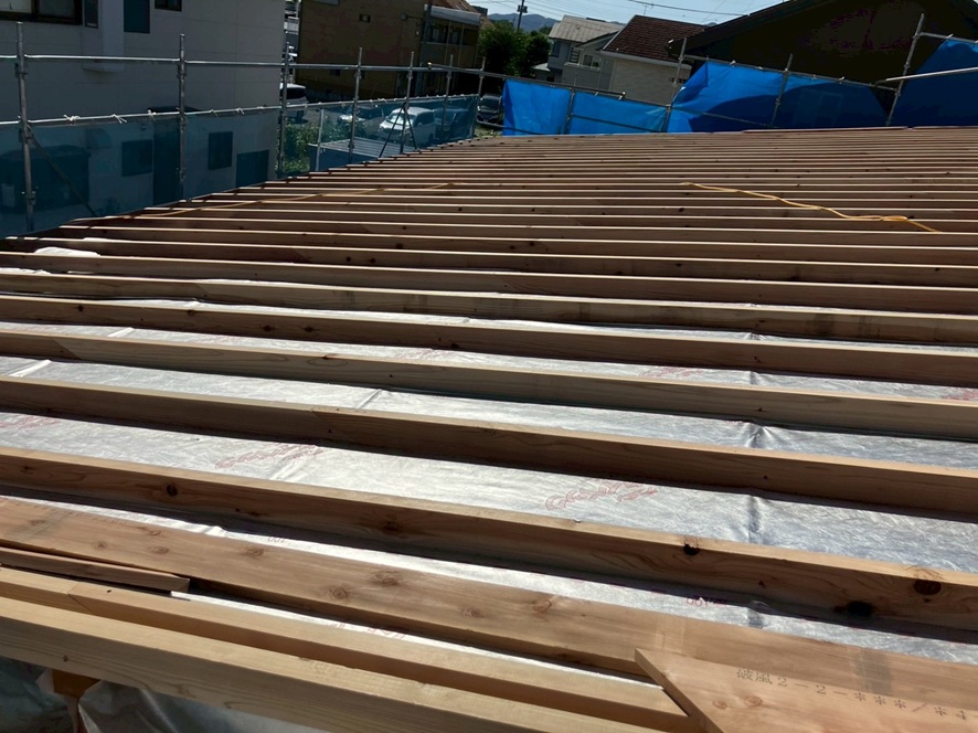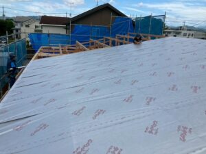 こちらは、堀米町のM様邸です。 土曜日の報告になります。タルキ下にタイベックシルバーを敷いている写真です。