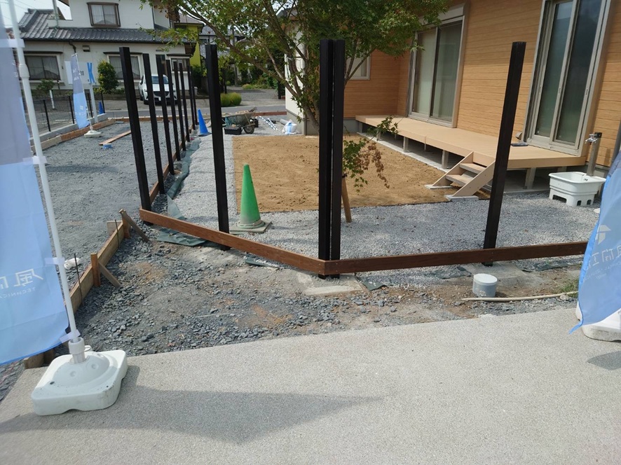 こちらは、昨日の植下モデルです。社員大工「アキラー」ウッドフェンスの根がらみの木を取り付けました。
