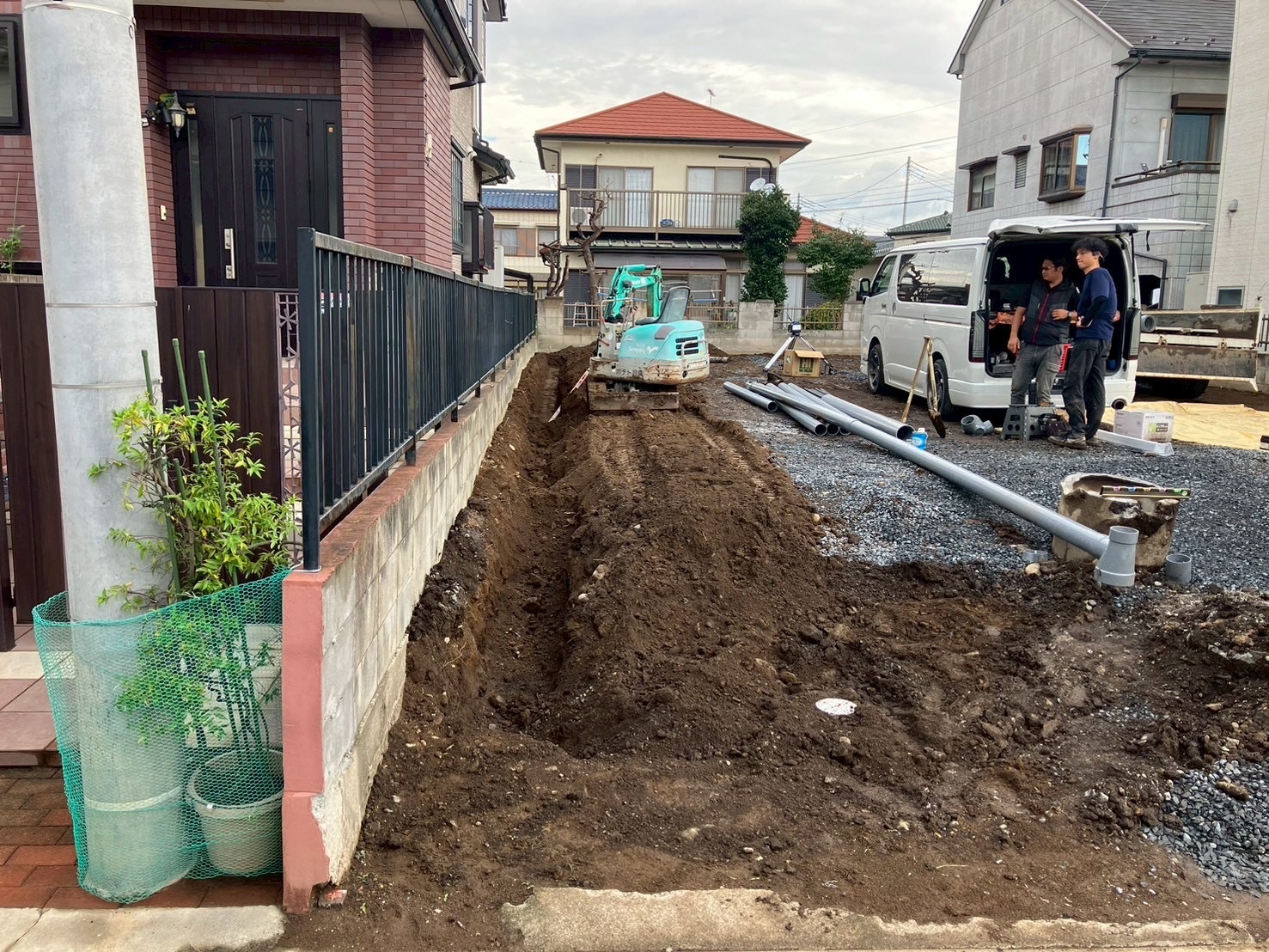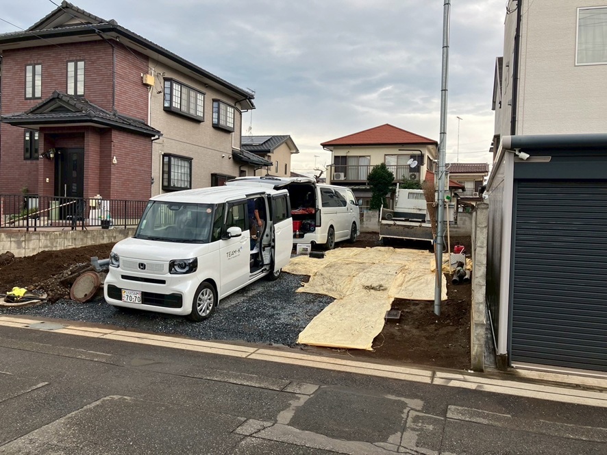 公共下水までつながる排水を基礎工事前に行います。 設備屋コンビ一服しているところです!