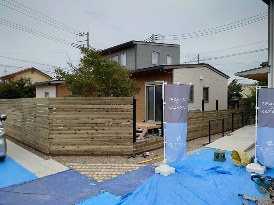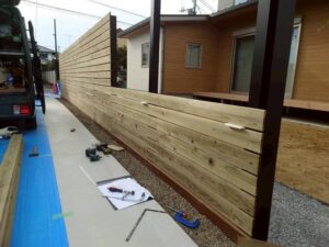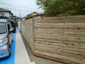 お隣のO様邸東部分ももう少しで完了です。 この板は、杉ですが加圧注入してあり 木製のジェットコースターに使用している