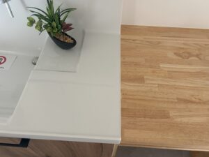 いつものテーブルをセッティングしています。 キッチン天井下がり天井には、アクセントクロスが貼ってあります。