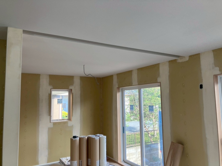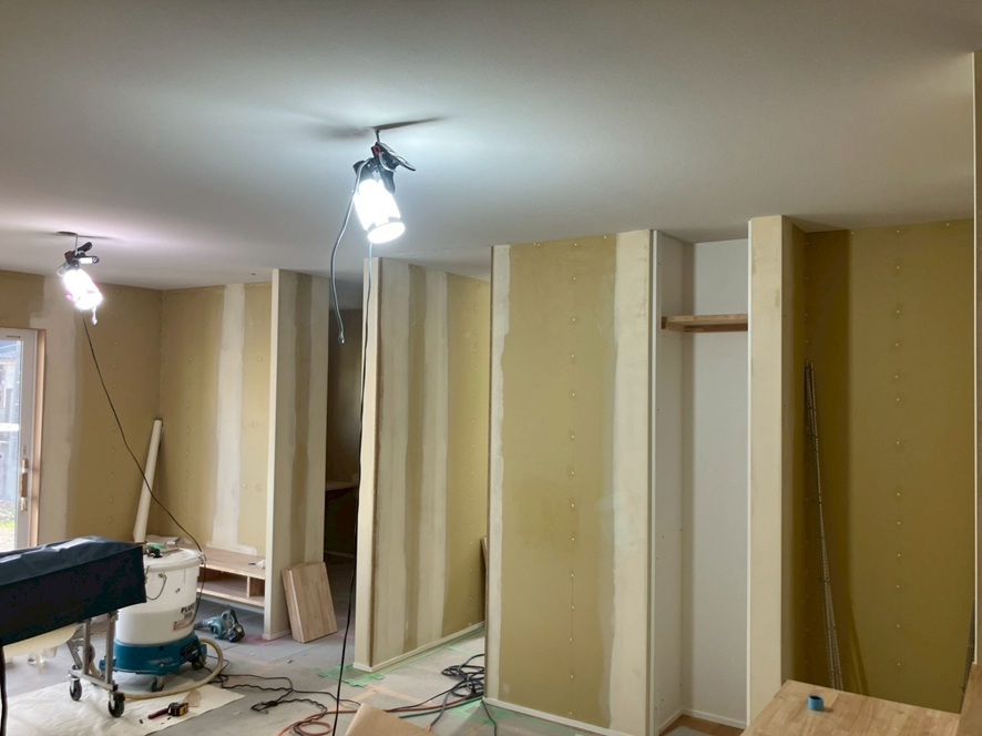 こちらの写真は、3日くらい前の写真です。今日でクロス工事完了していると報告を受けました。 次は、キッチンが入ります。